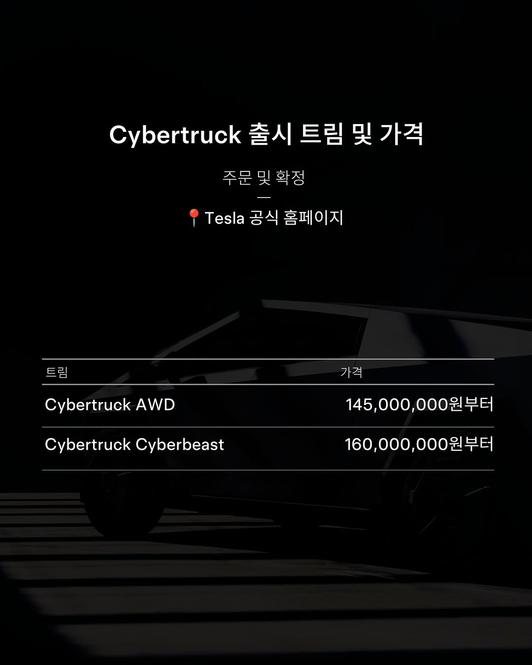 혁신과 스타일의 새 지평을 연 Tesla Cybertruck (테슬라 사이버트럭) 이 드디어 한국에 출시됩니다.